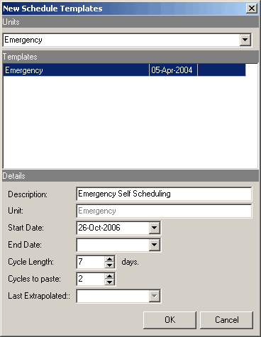 For Self Scheduling to work, you must select a unit that was also selected on the Self Scheduling Setup window. - Type a readily identifiable name for the template in the Description box.