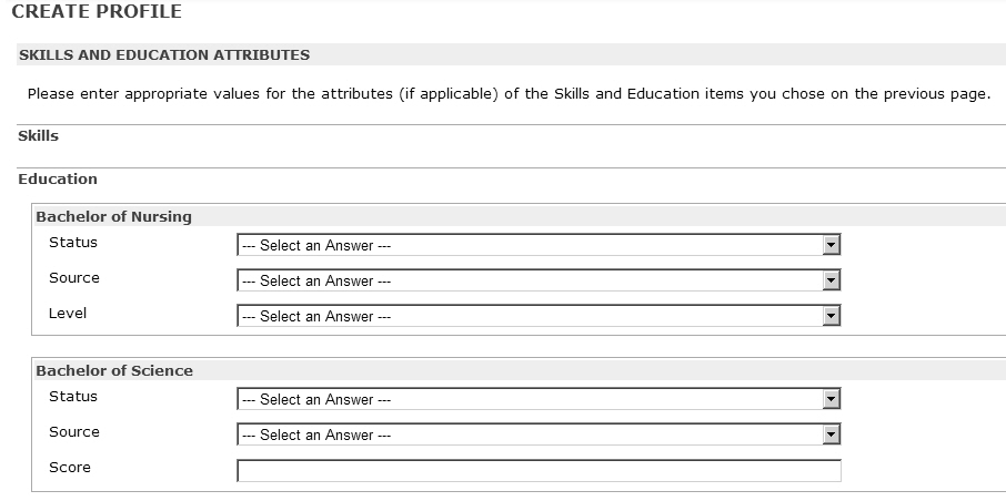 When creating a profile in Quadrant Self Service, applicants are asked to select the Skill and Education attributes that apply to them. The available choices are imported from the Competencies window in Quadrant which also determines how Skill and Education options appear on the Create Profile pages. If the available choices, or how they appear on the page, are not satisfactory you can go into the Competencies window to make changes.