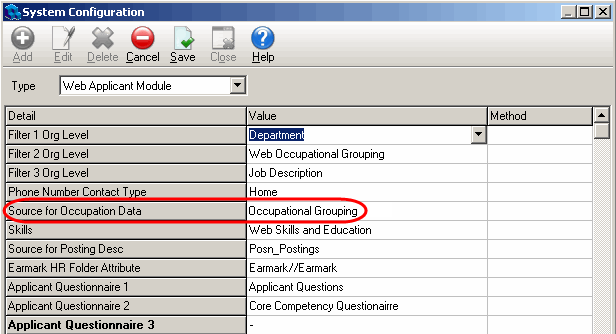 After you've created an Org Level for Occupational Groups and UDFs for recruiting, you need to select them on the System Configuration window of the Administration menu so they are available in Quadrant Self Service.